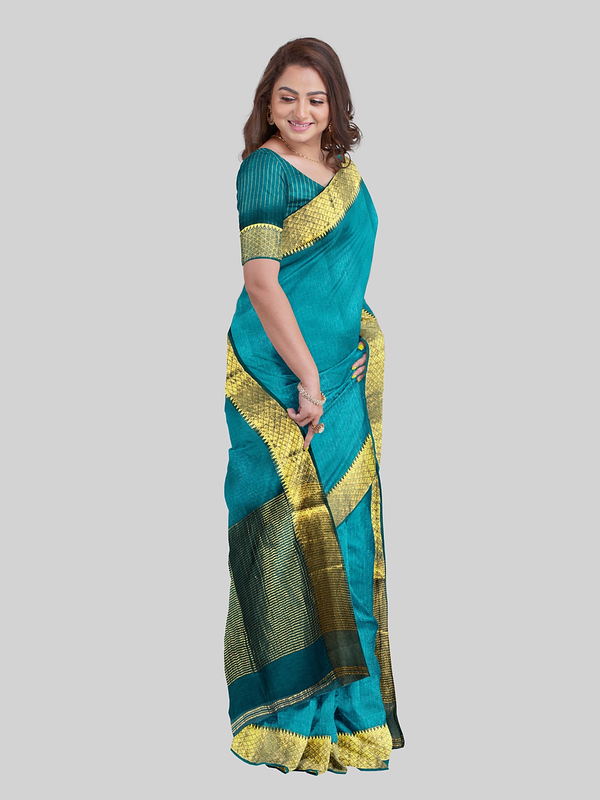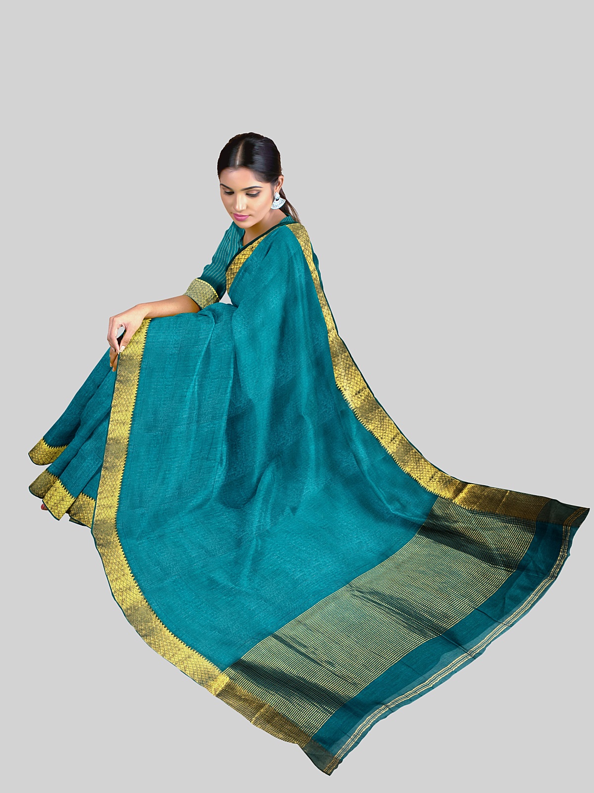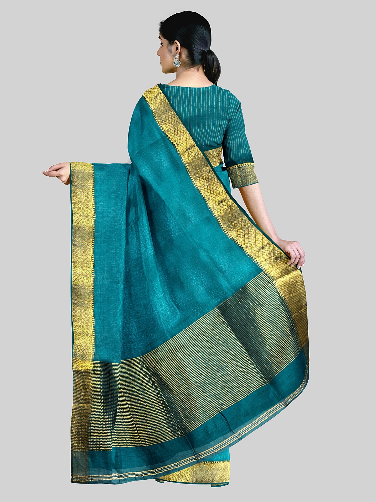Blouse: Approx 1m unstitched blouse of the same color and fabric with zari phera weaving and border (woven with saree)