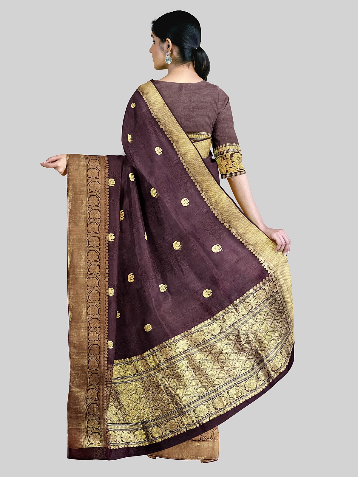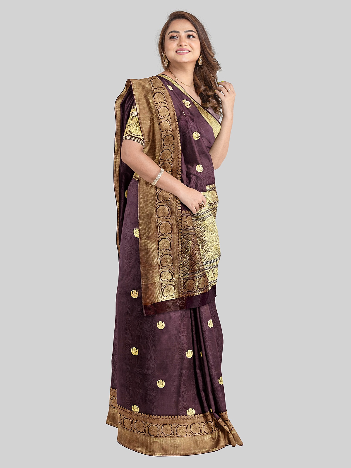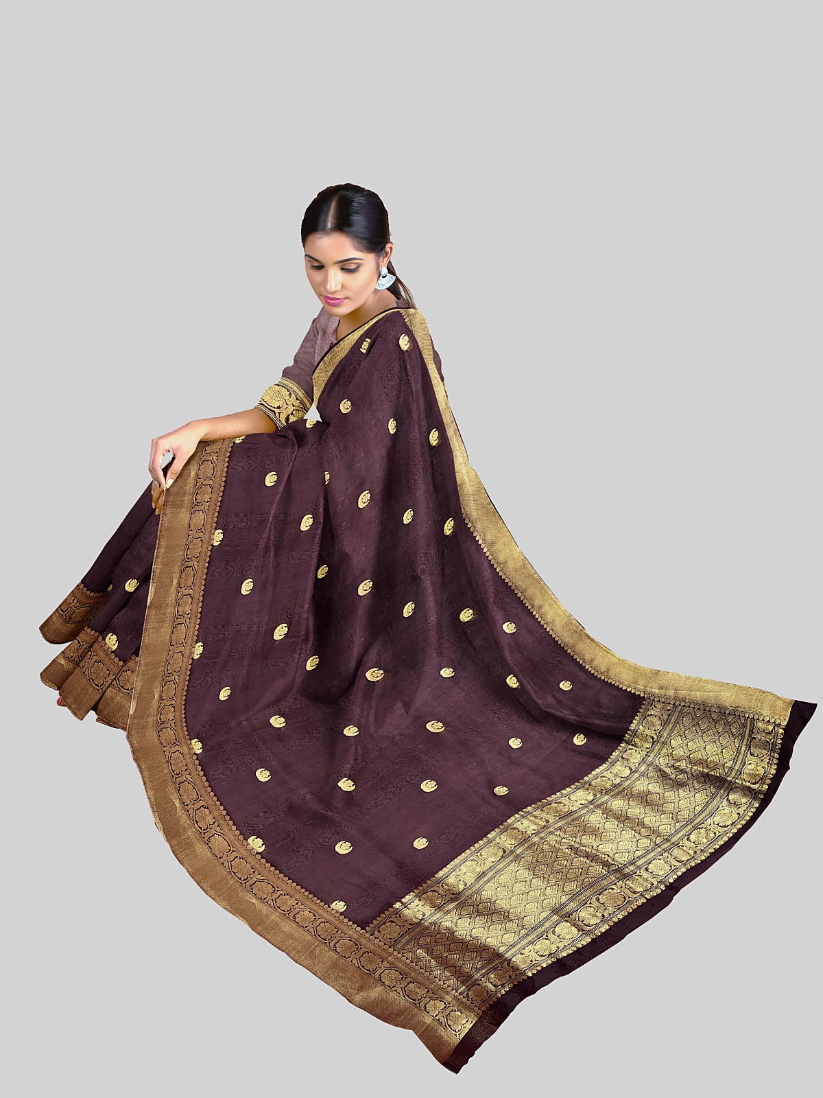 Saree: Auburn brown with small ardhchand buta and zari-woven pallu and border