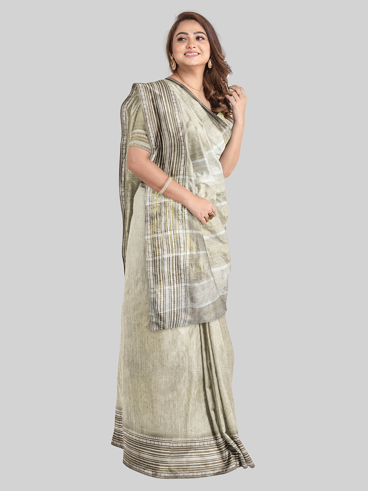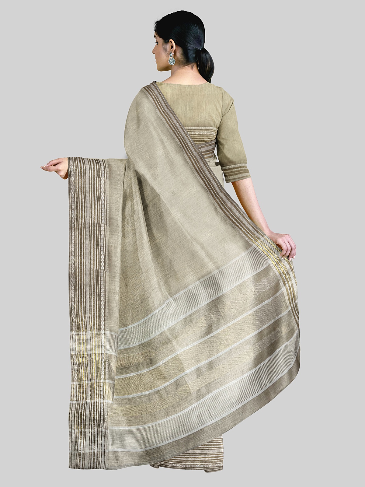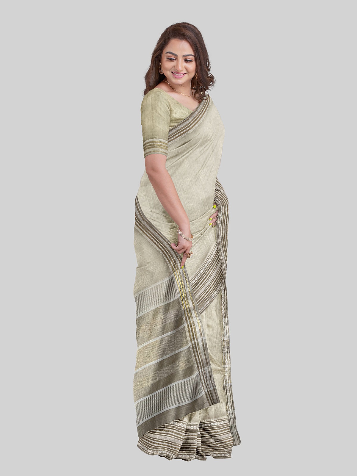 Saree: Beige with White Khapa Weaving Border and White Phera Weaving on Pallu