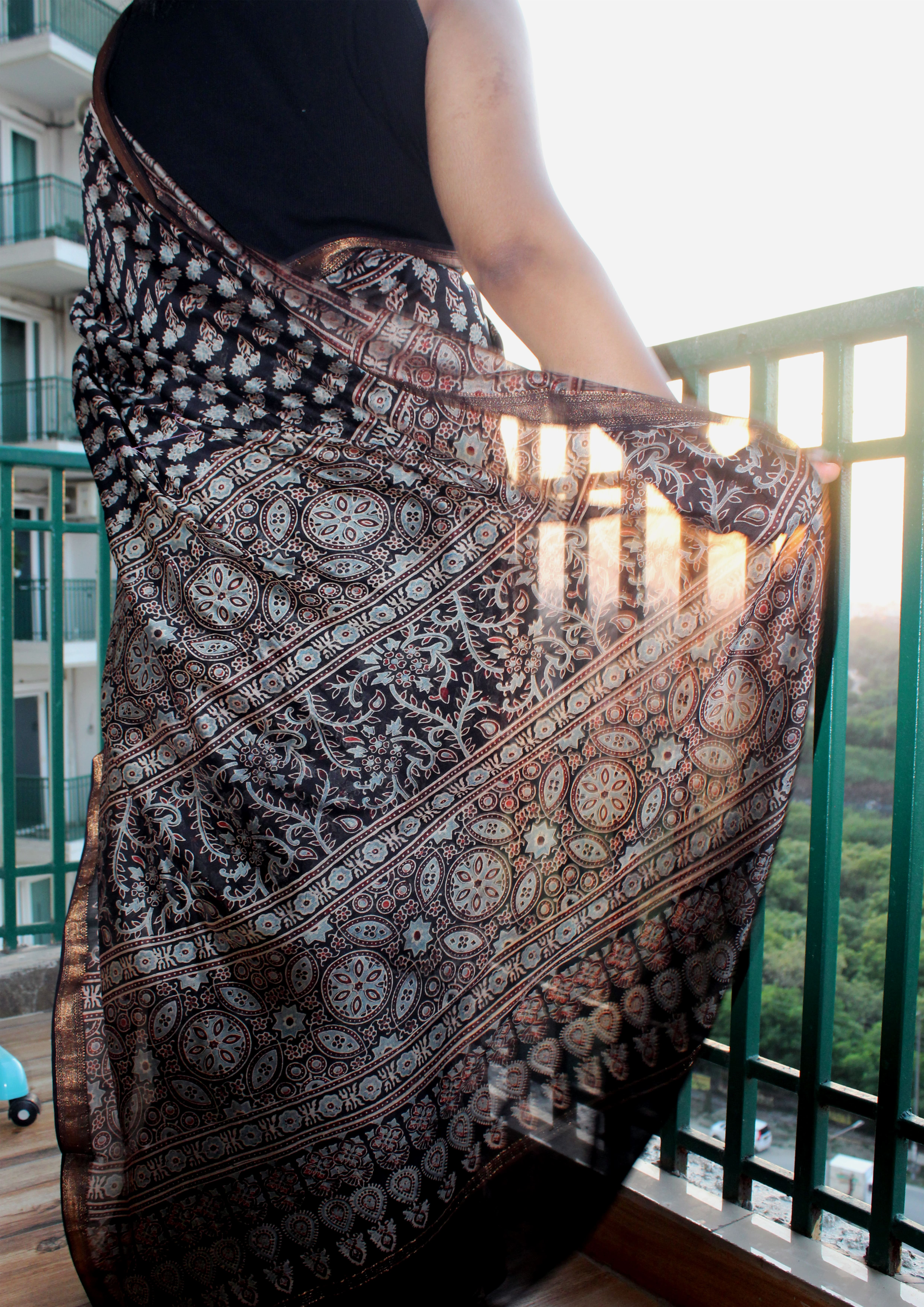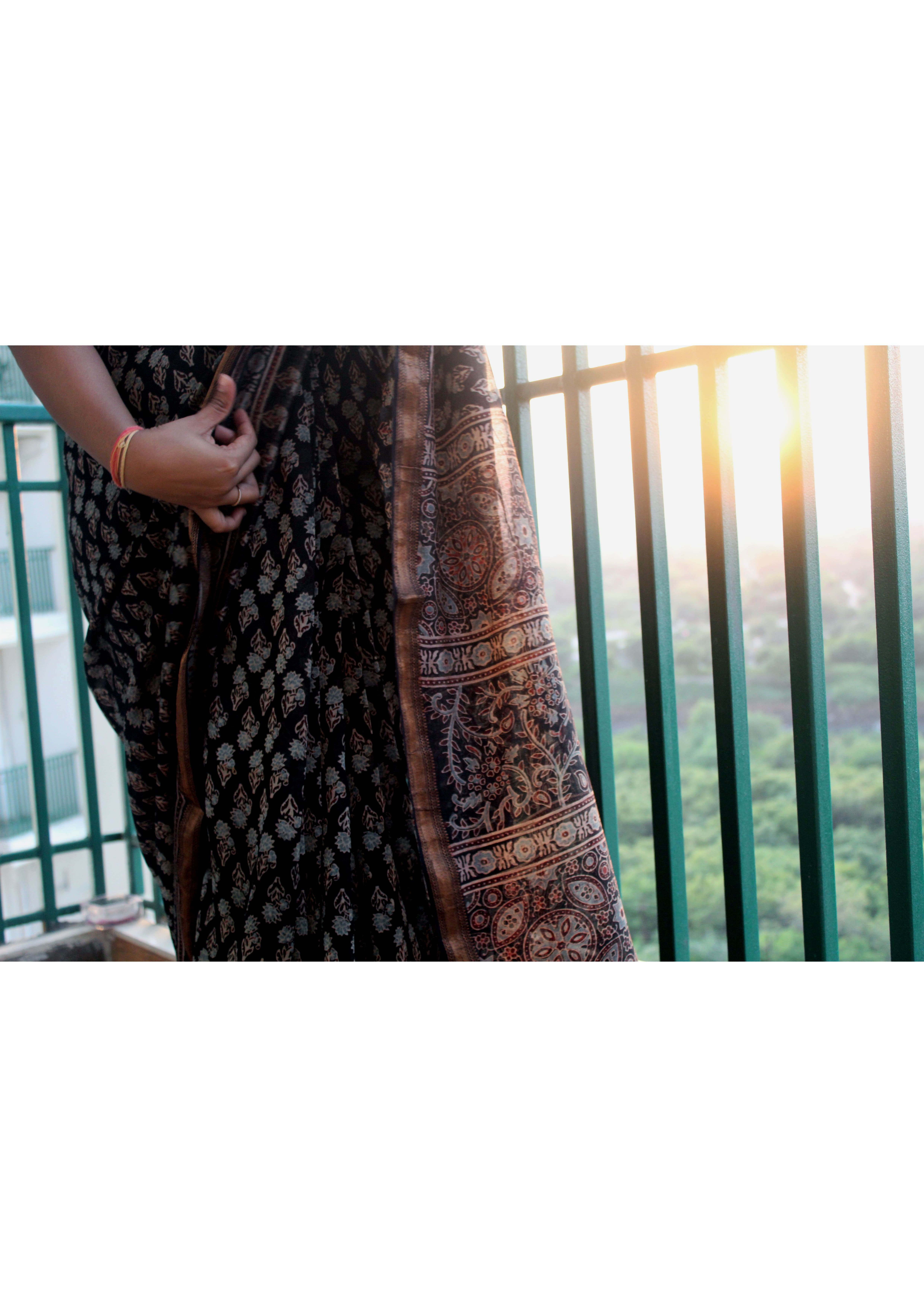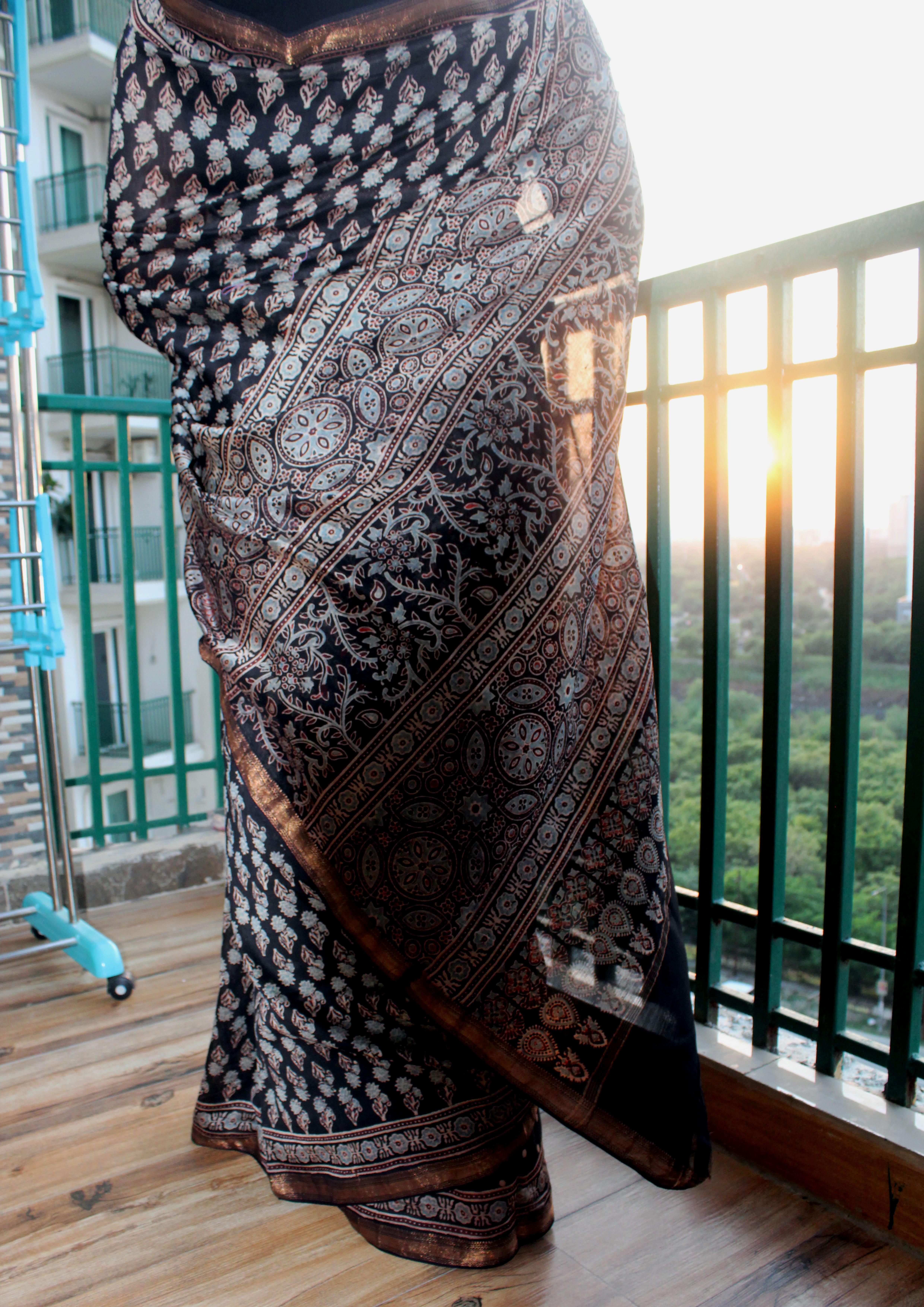 Saree: Black with light blue Ajrakh handblock print and zari border