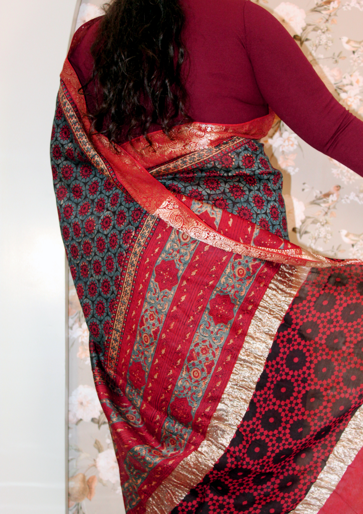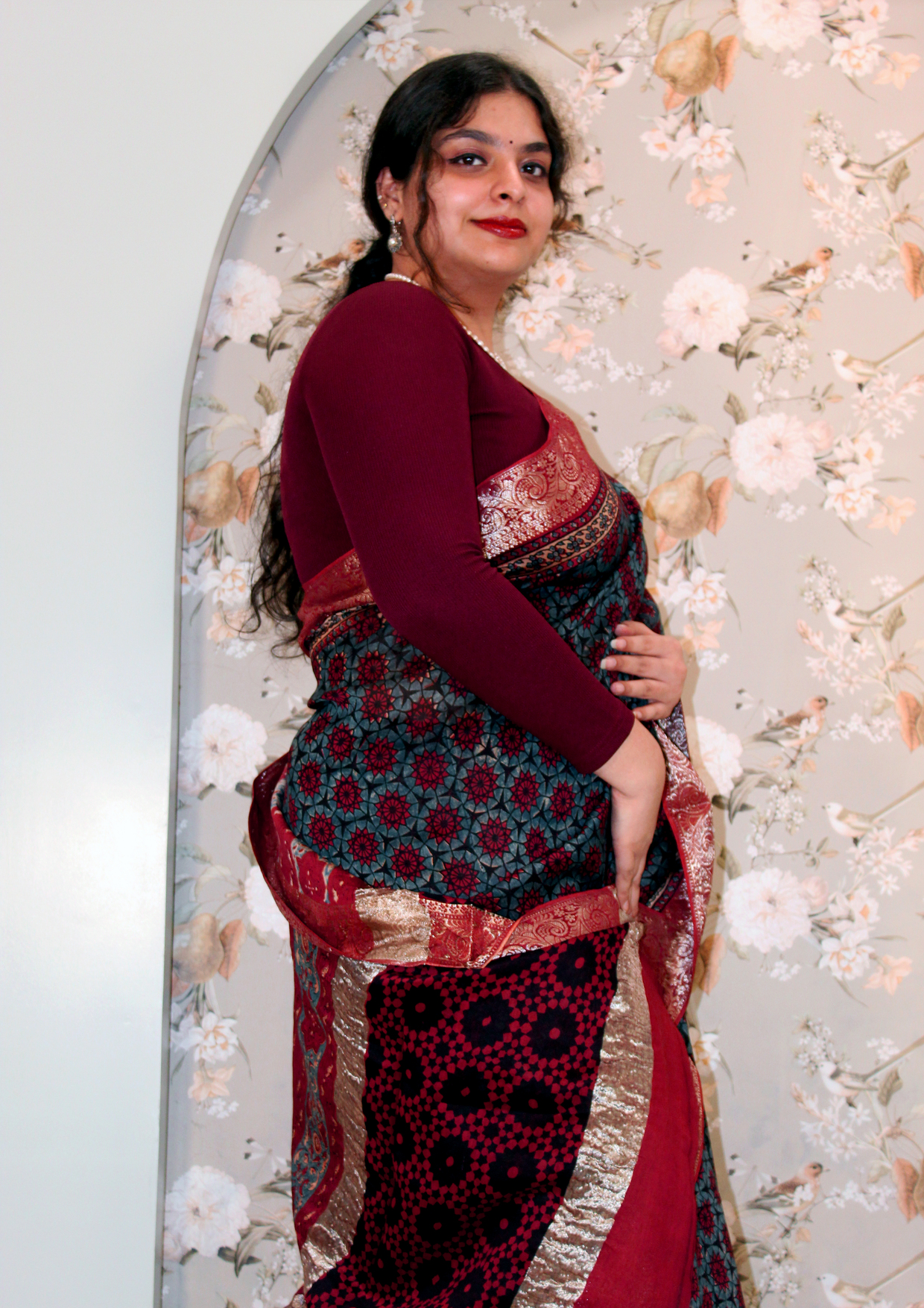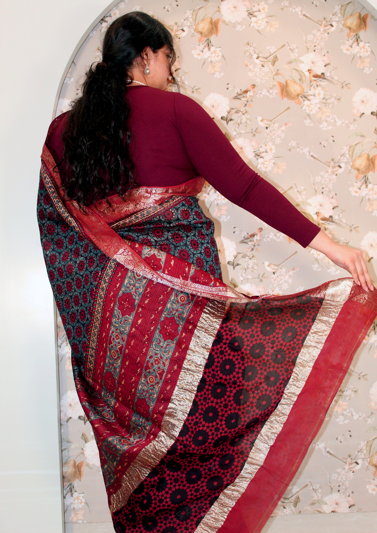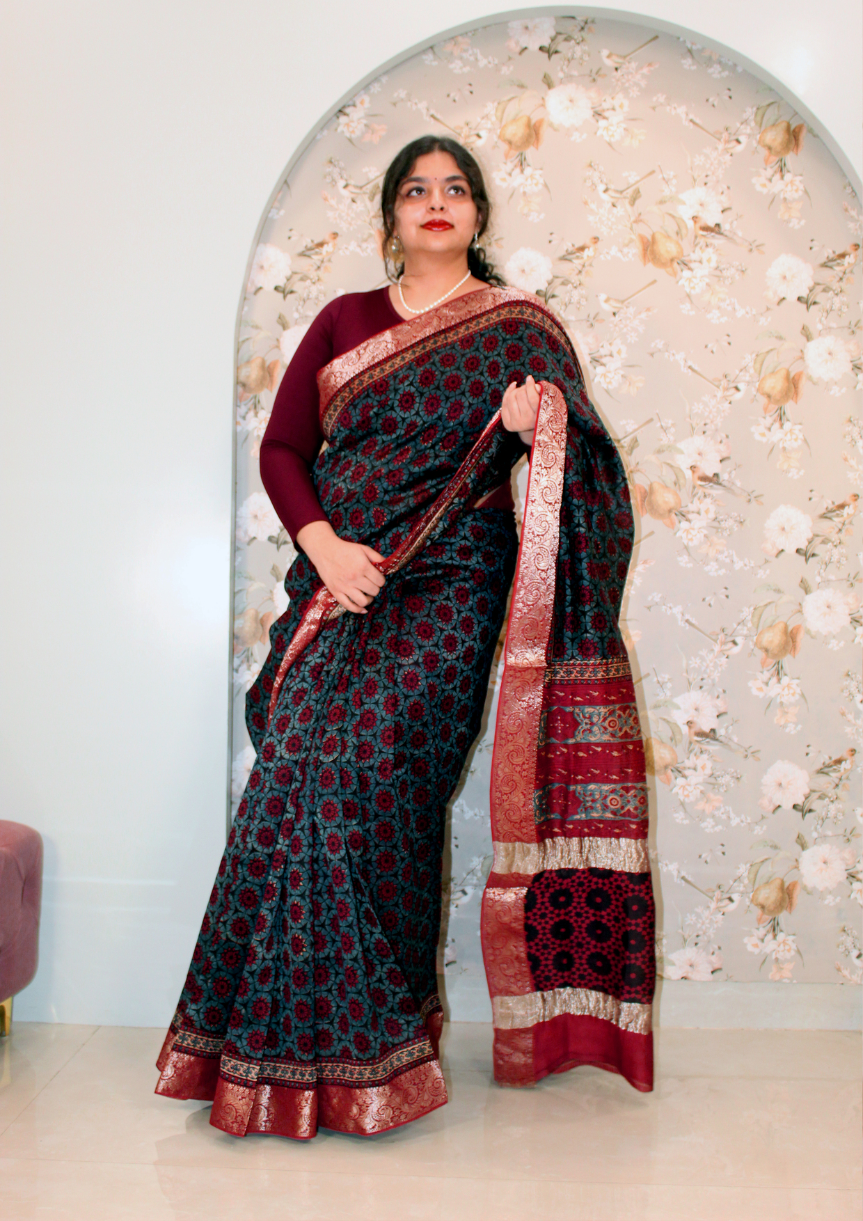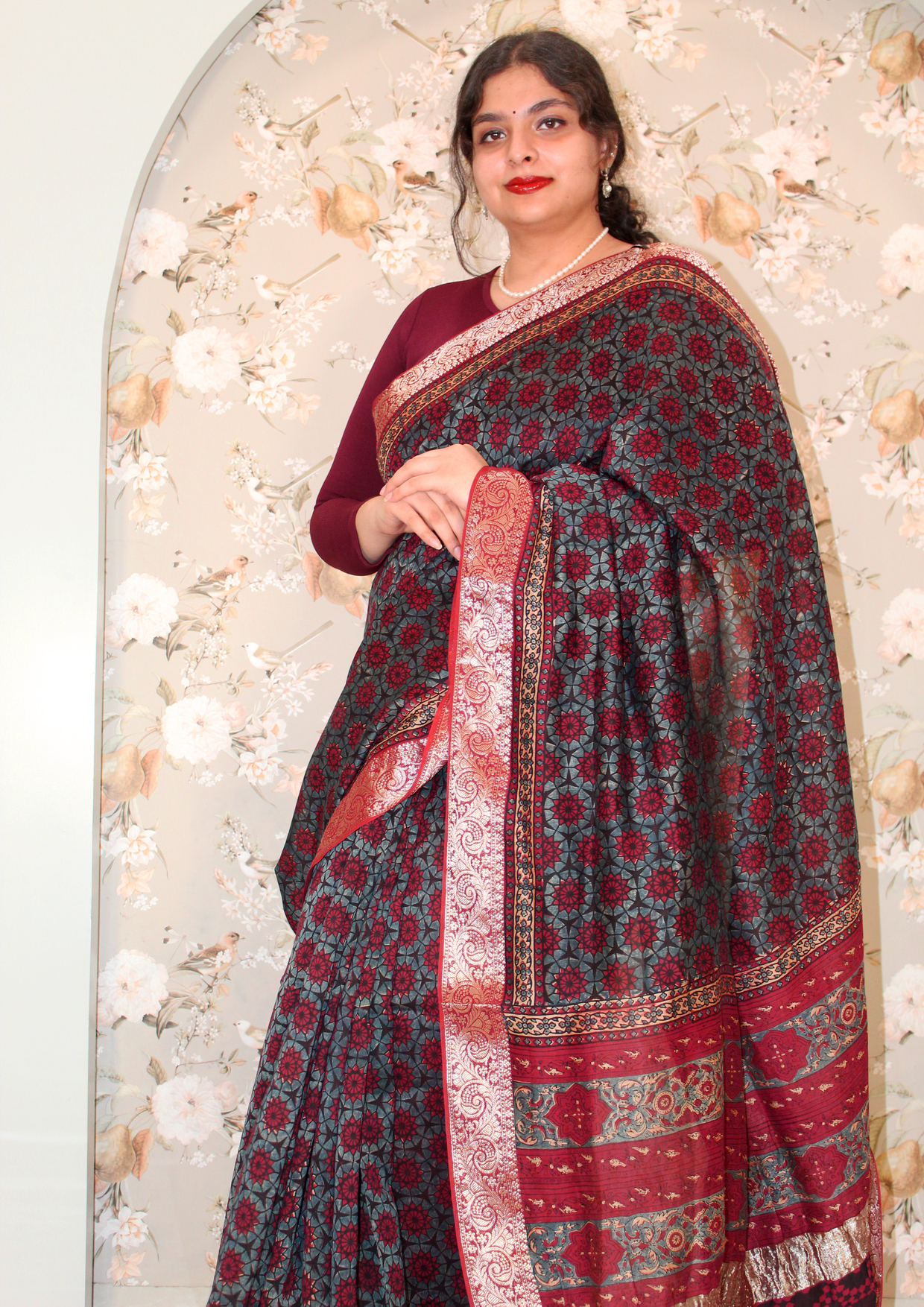 Saree: Black with red and blue Ajrakh star motifs and zari border