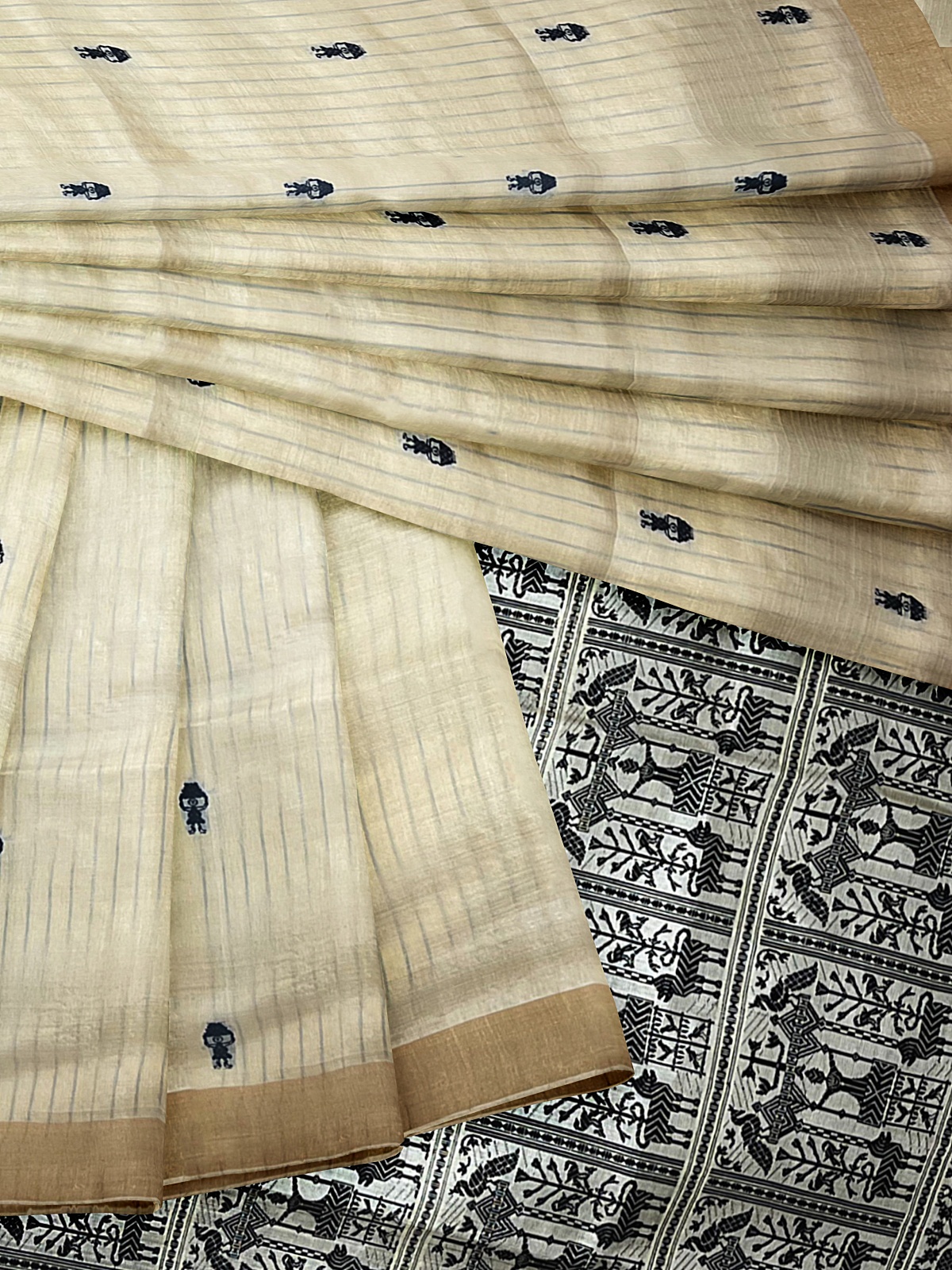 Saree: Cream with black Bastar Kala weaving on the pallu and buta