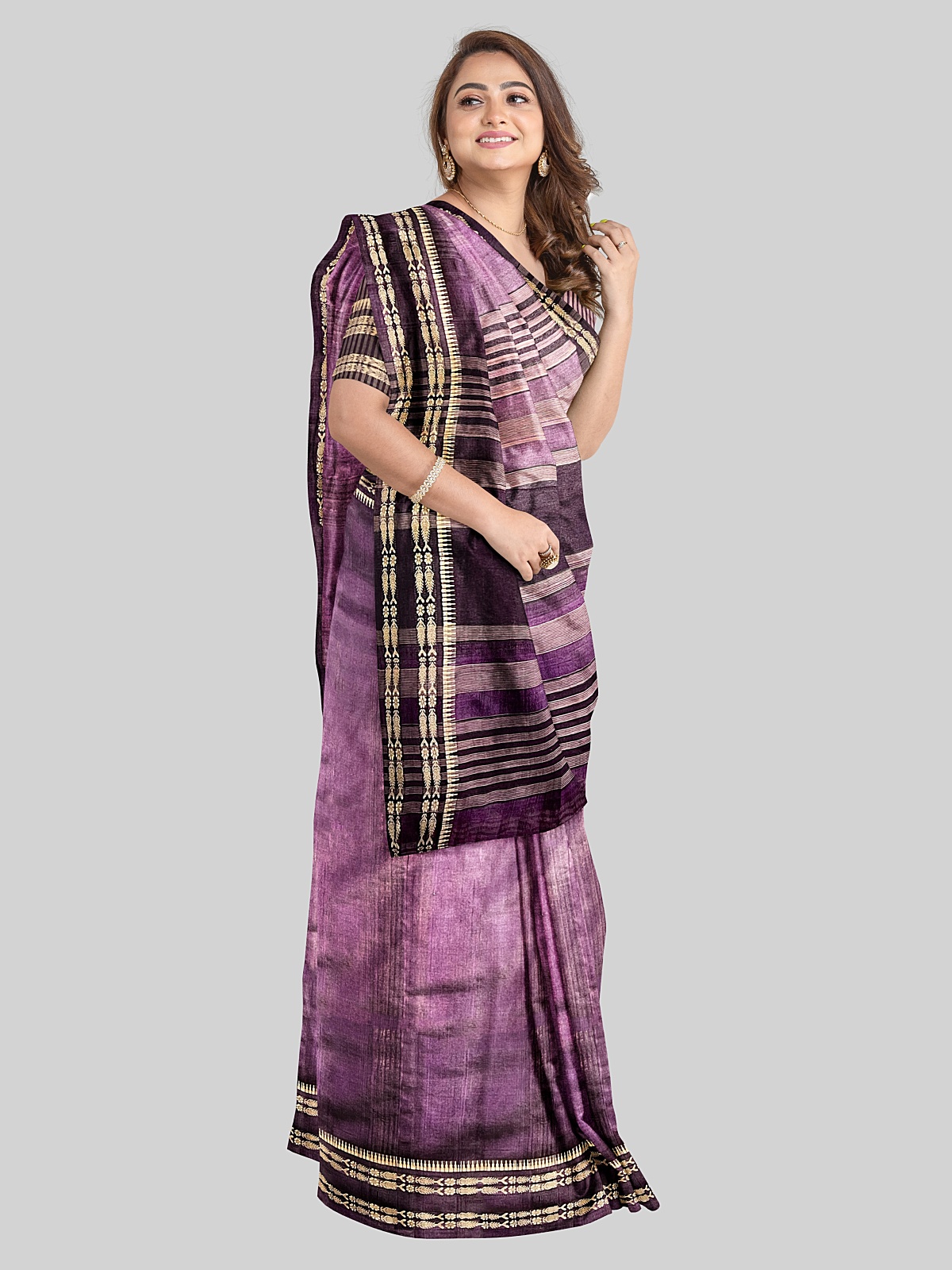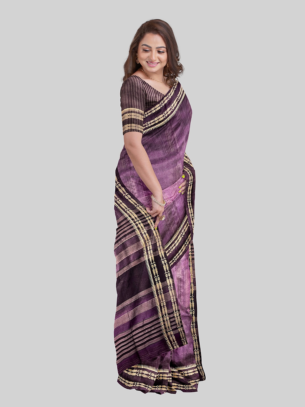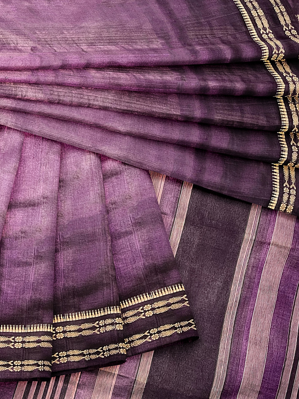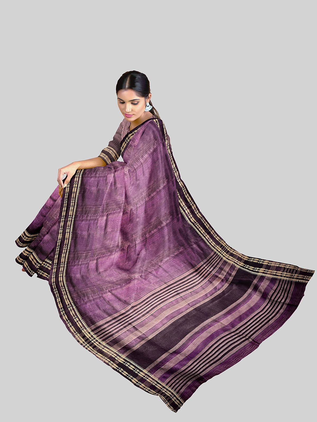 Saree: Dark mauve with purple and beige phera weaving and dobby fish border