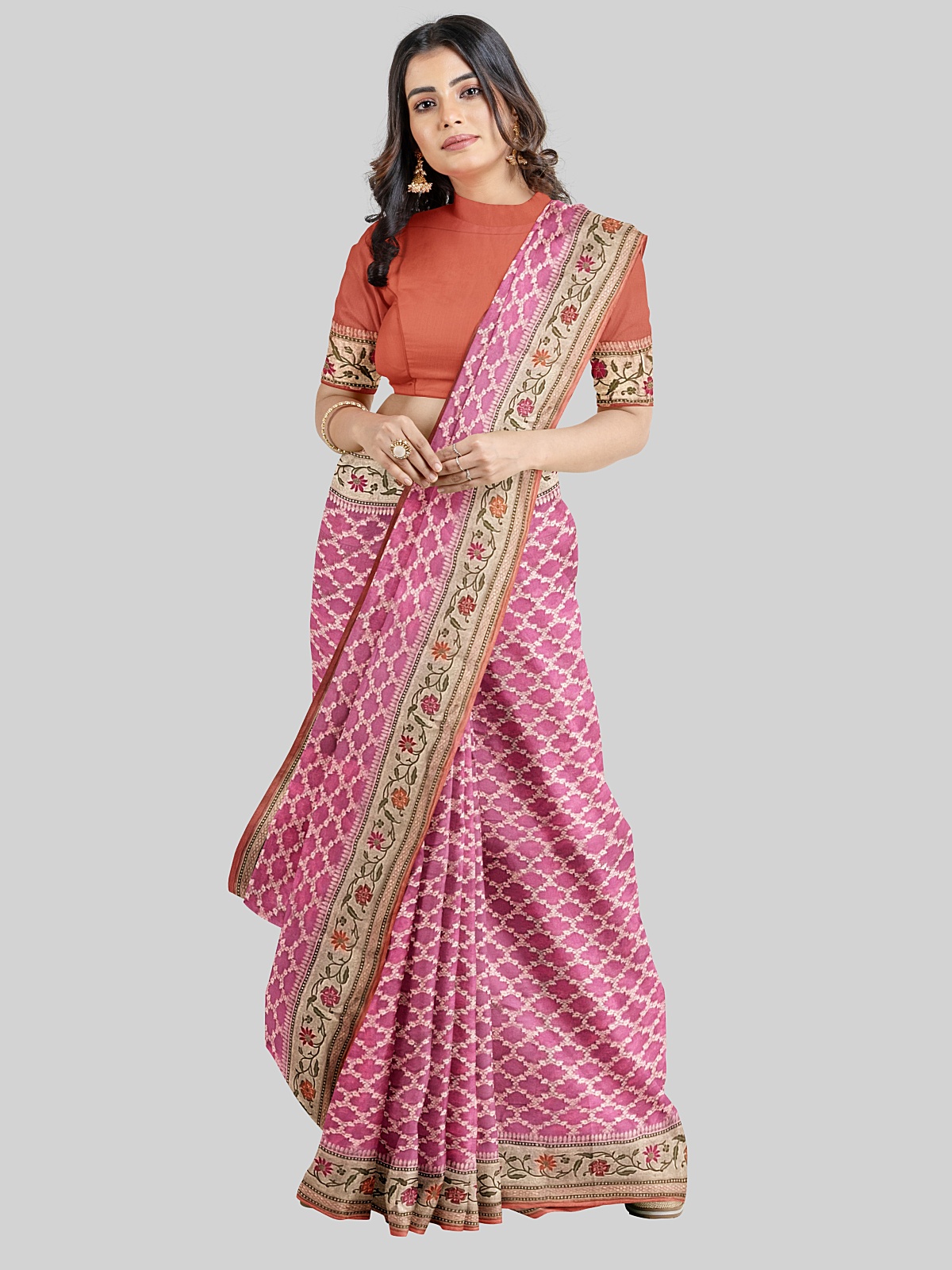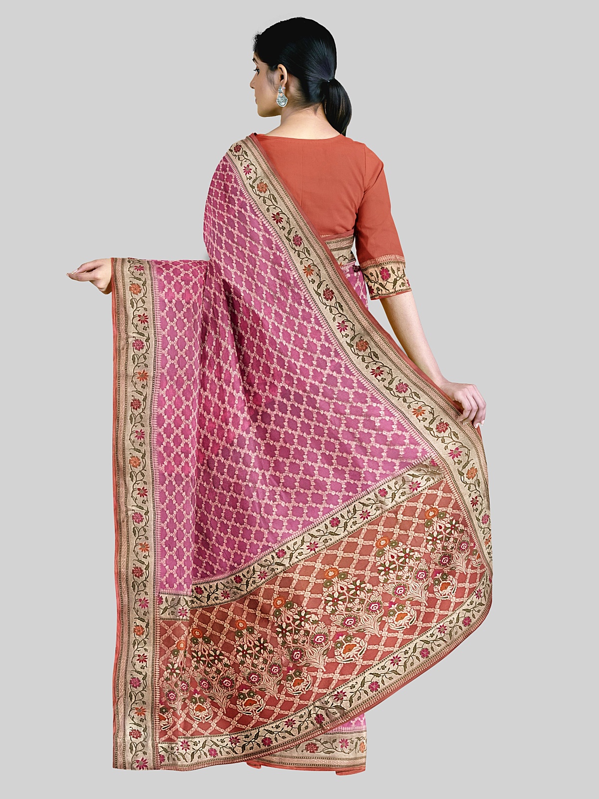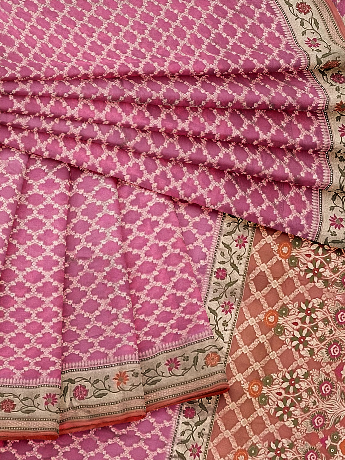 Color - Pink with full zari jaal weaving complimenting peach palla and border