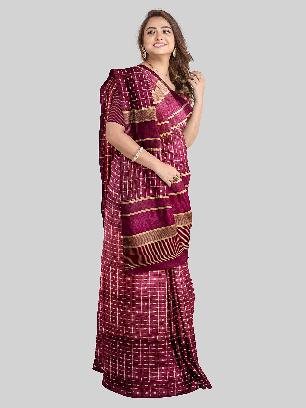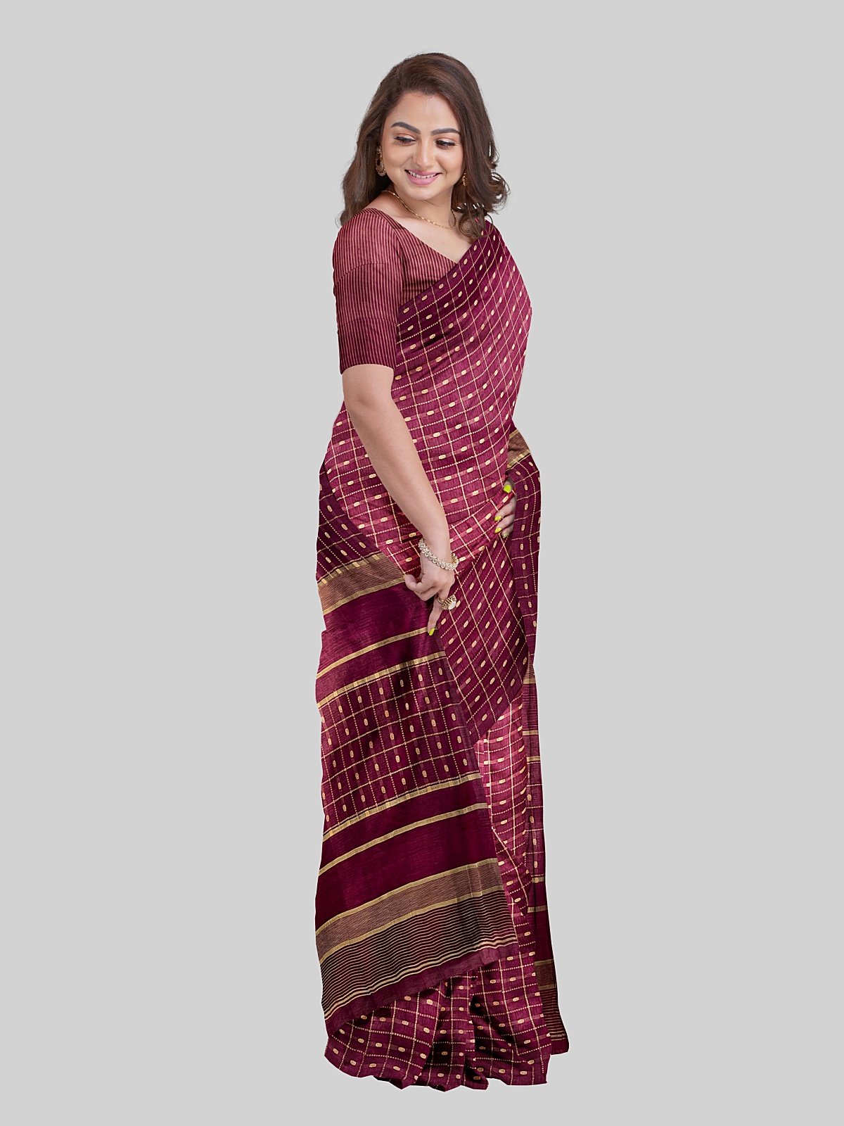 Saree: Available in three colors. Black, Plum and Red (with intricate thousand buta weaving in wheat color)