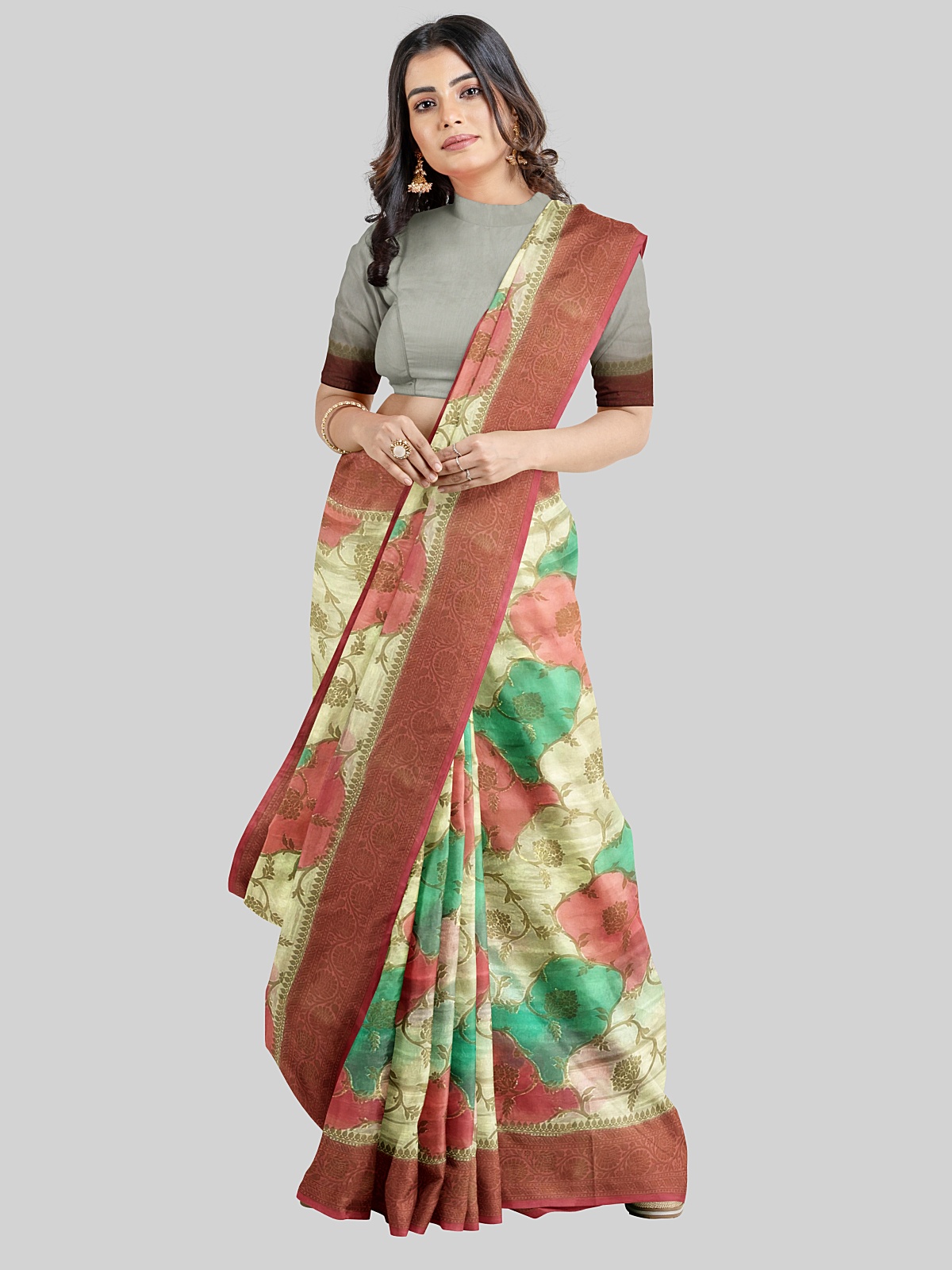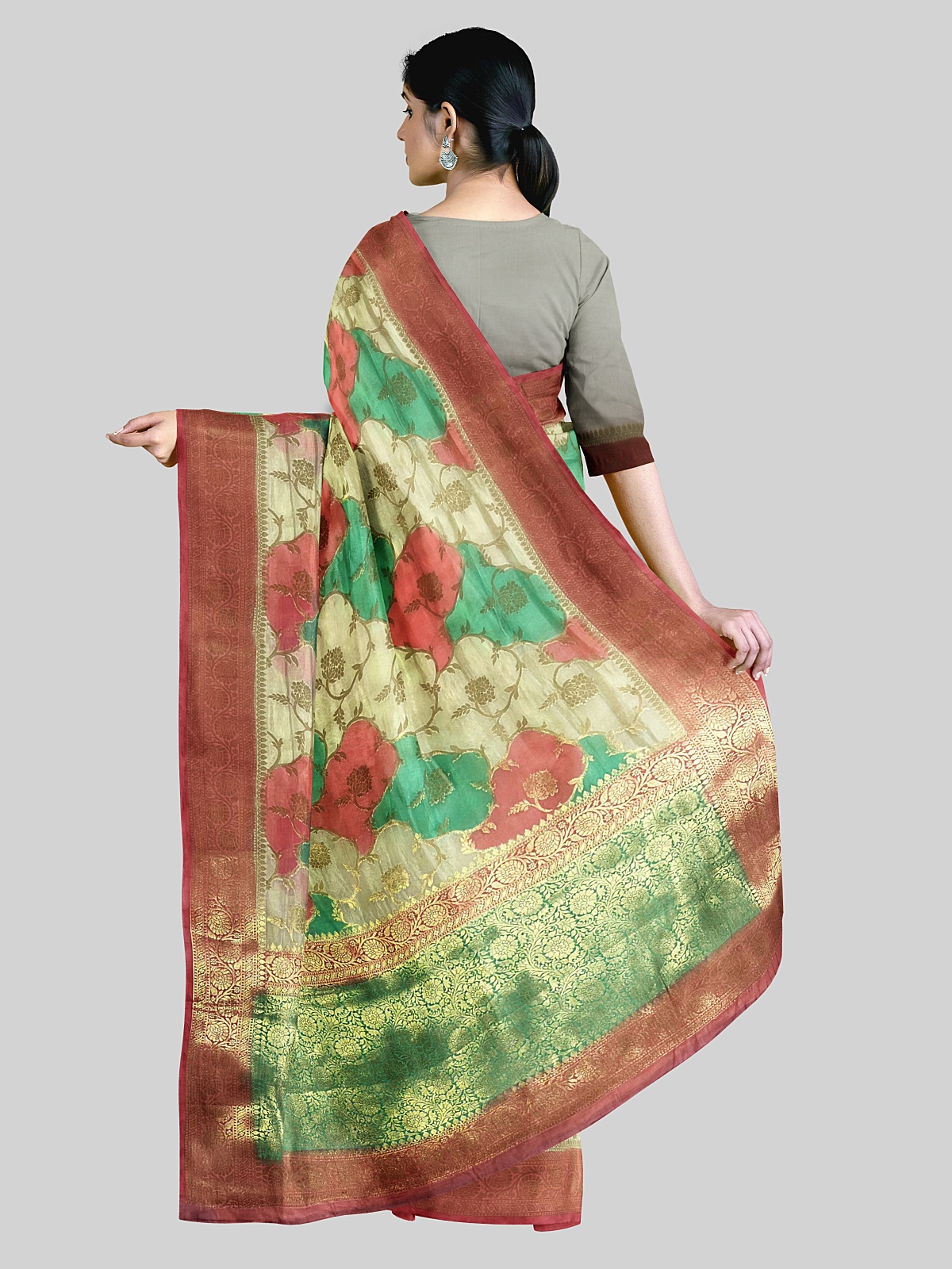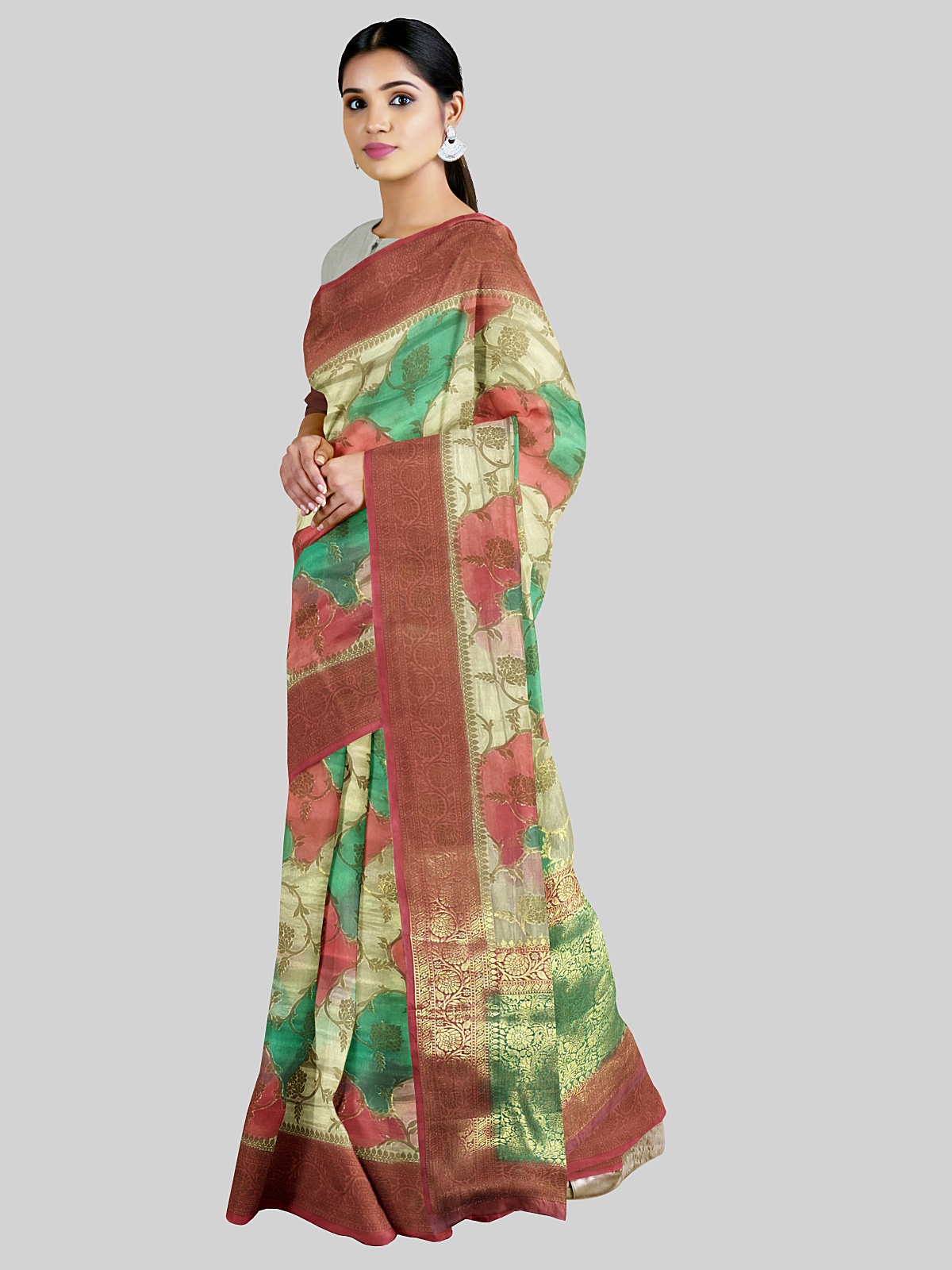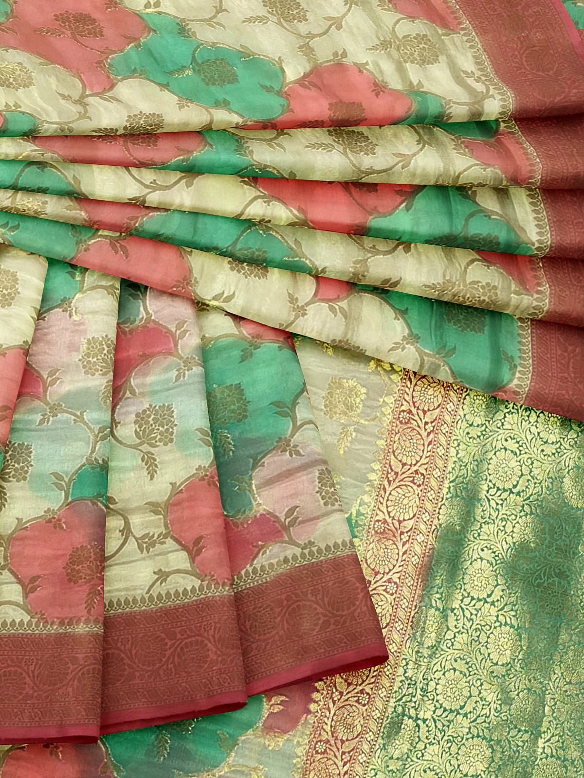 colour - shades of off white, pink and green (rangkat pattern with full jaal work & pink border)
