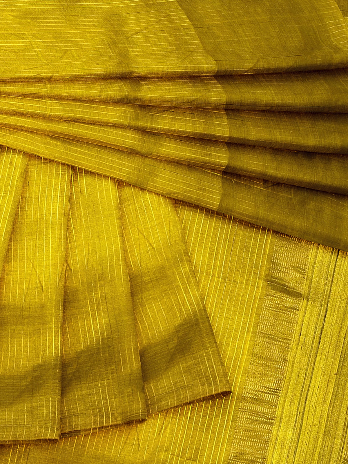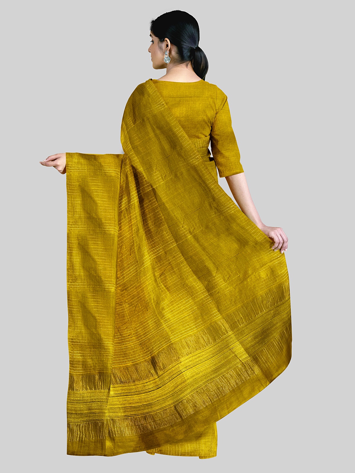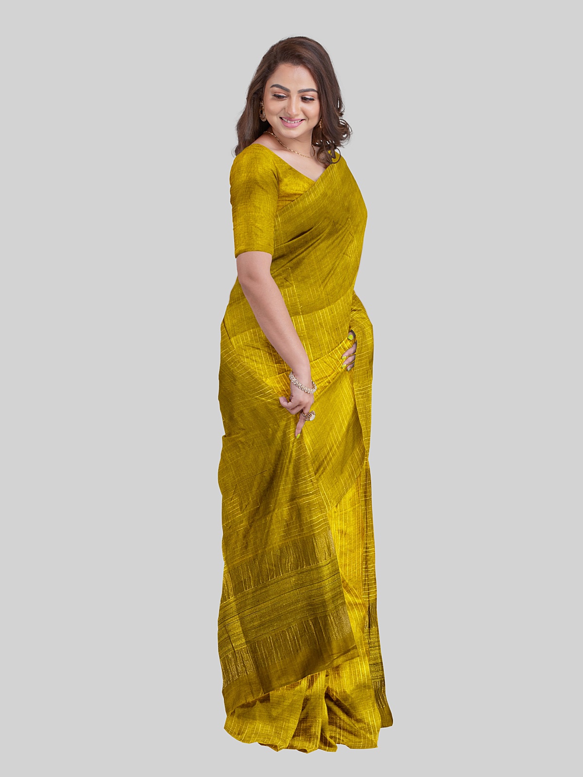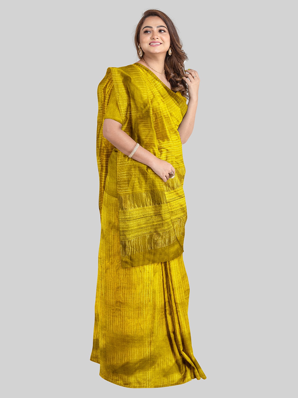 Saree: Mustard yellow with self-color phera weaving and ghicha tussar detailing on palla