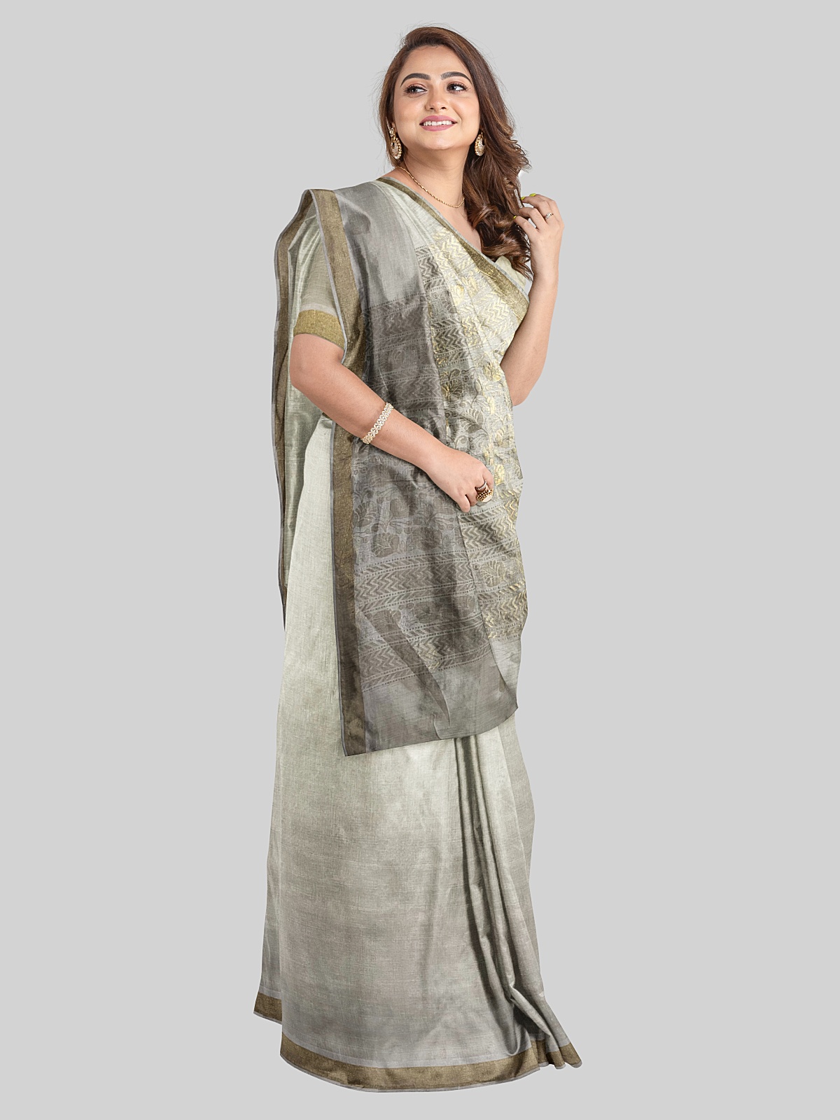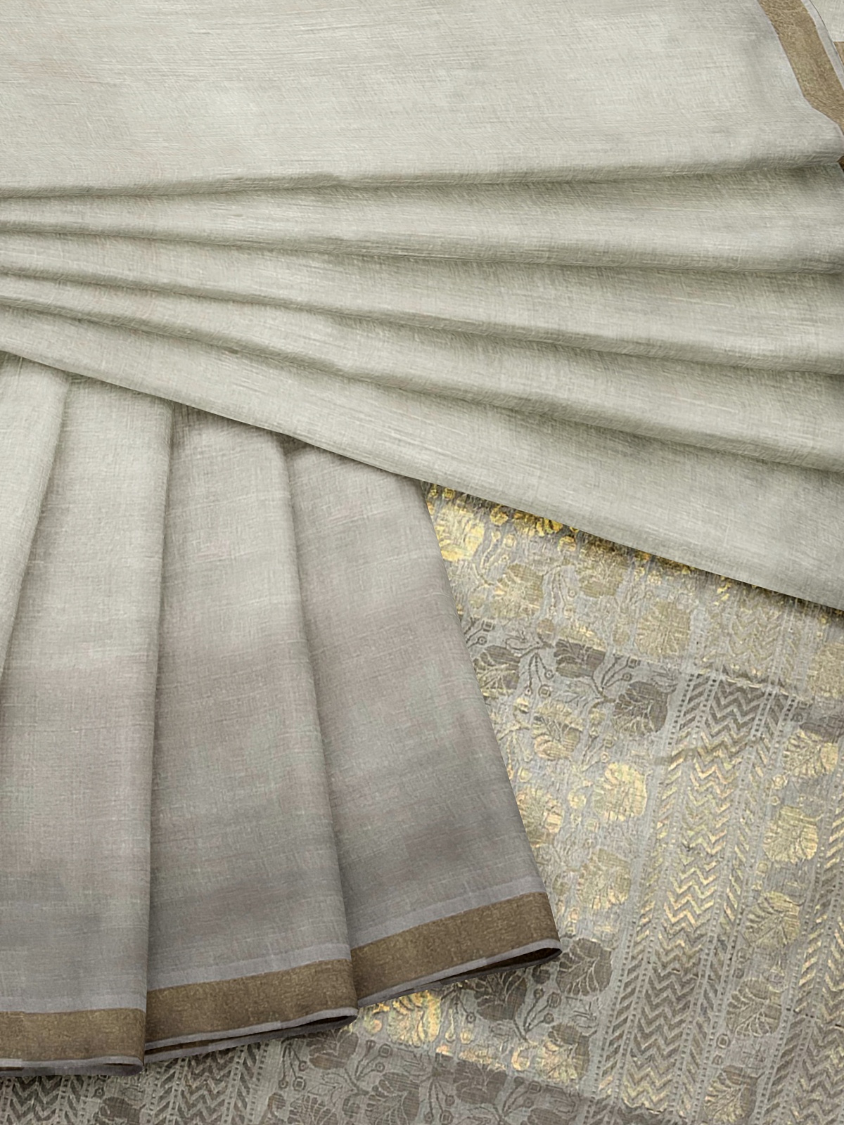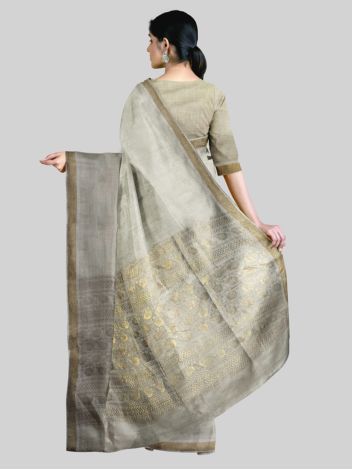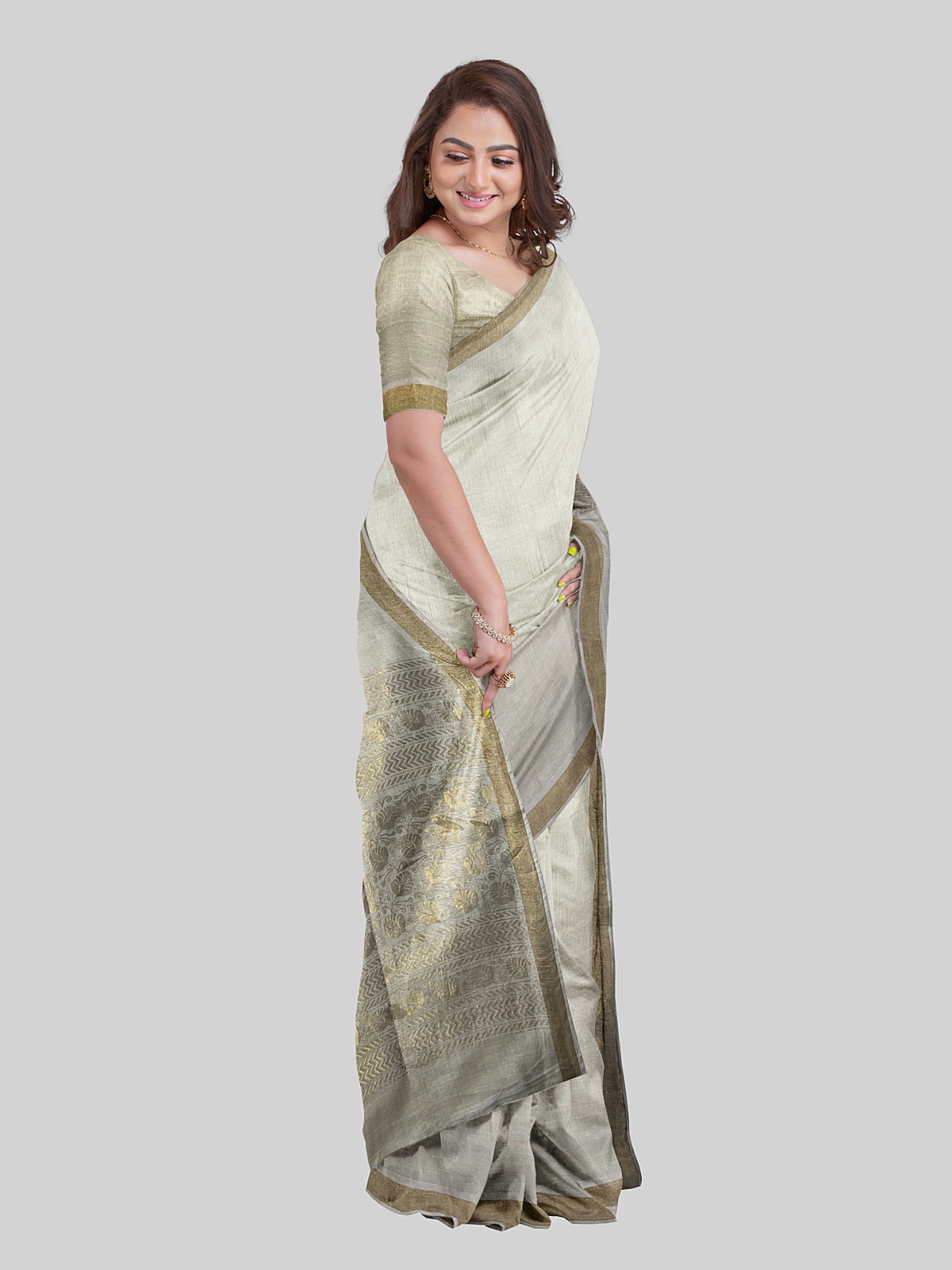 Saree: Natural (Dull Golden Beige) Tussar with Golden Zari Floral Phera Weaving