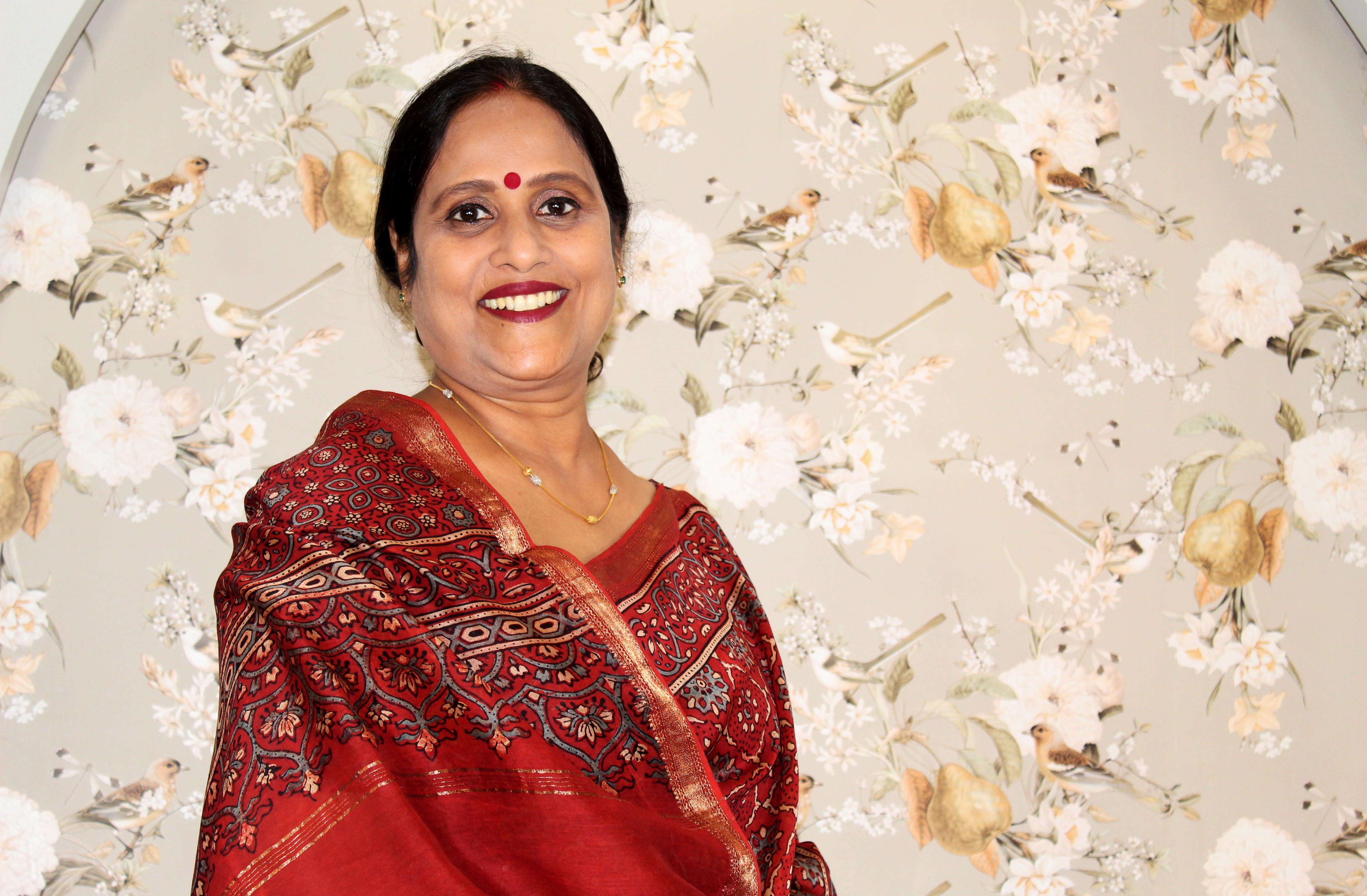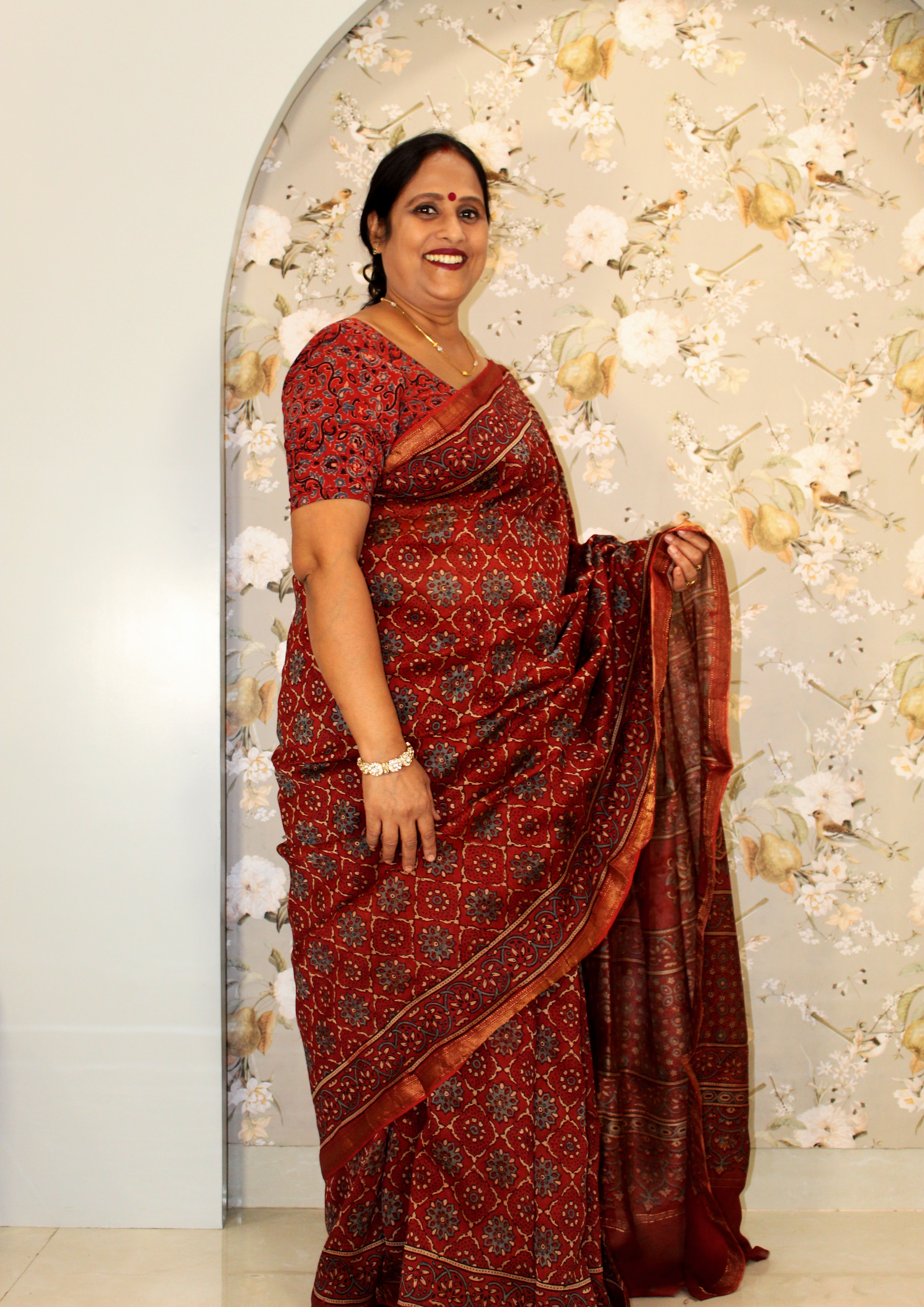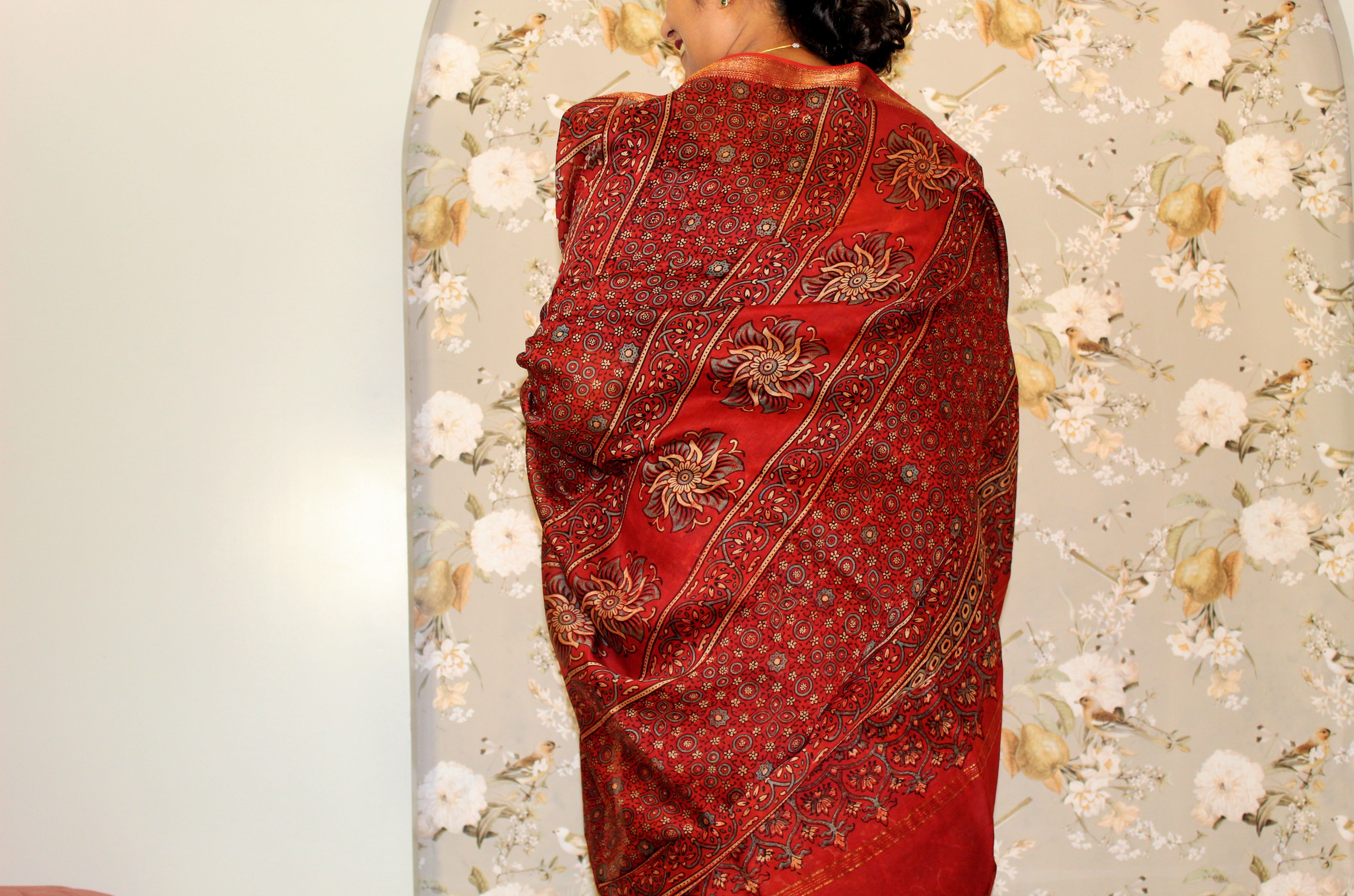 Saree: Red with blue Ajrakh handblock print and zari border