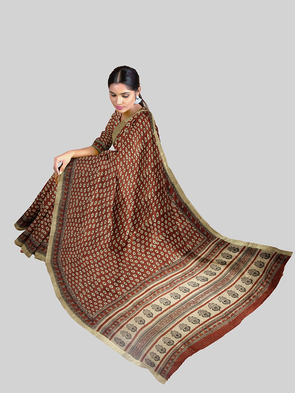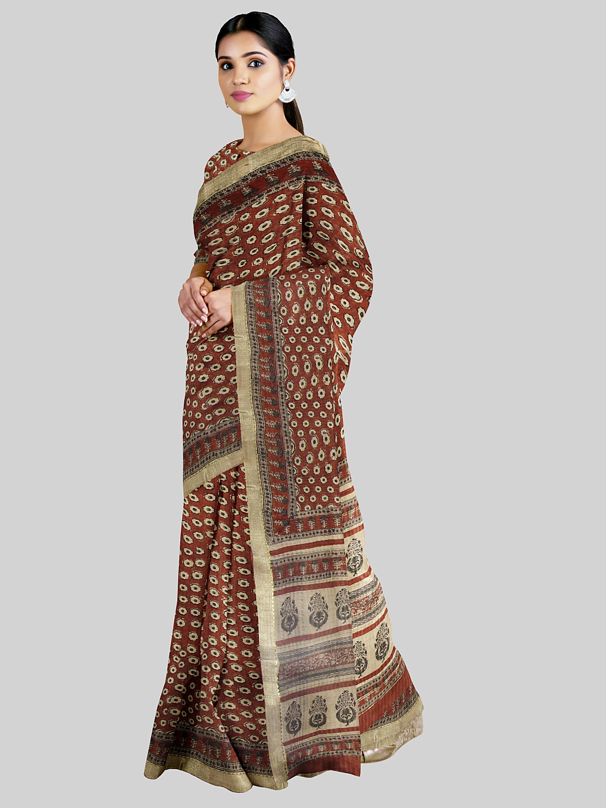 Blouse- Approx 1m unstiched beige colour contrasting blouse of same fabric with border of rust colour (woven with the saree)